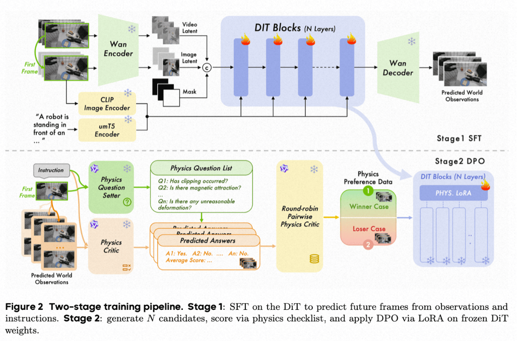 ● 第二阶段:偏好优化机制。在冻结主干的前提下,通过轻量级适配器对模型进行定向调整。这一阶段不再依赖像素相似度,而是以“物理合理性”作为优化信号——模型生成多个候选视频,由辅助评估模块判断其是否符合物理常识(如接触是否存在、运动是否受重力影响等),并据此强化合规行为、抑制违规输出。这使模型逐步学会区分“看起来像”和“物理上对”,从而提升在真实任务中的可靠性。