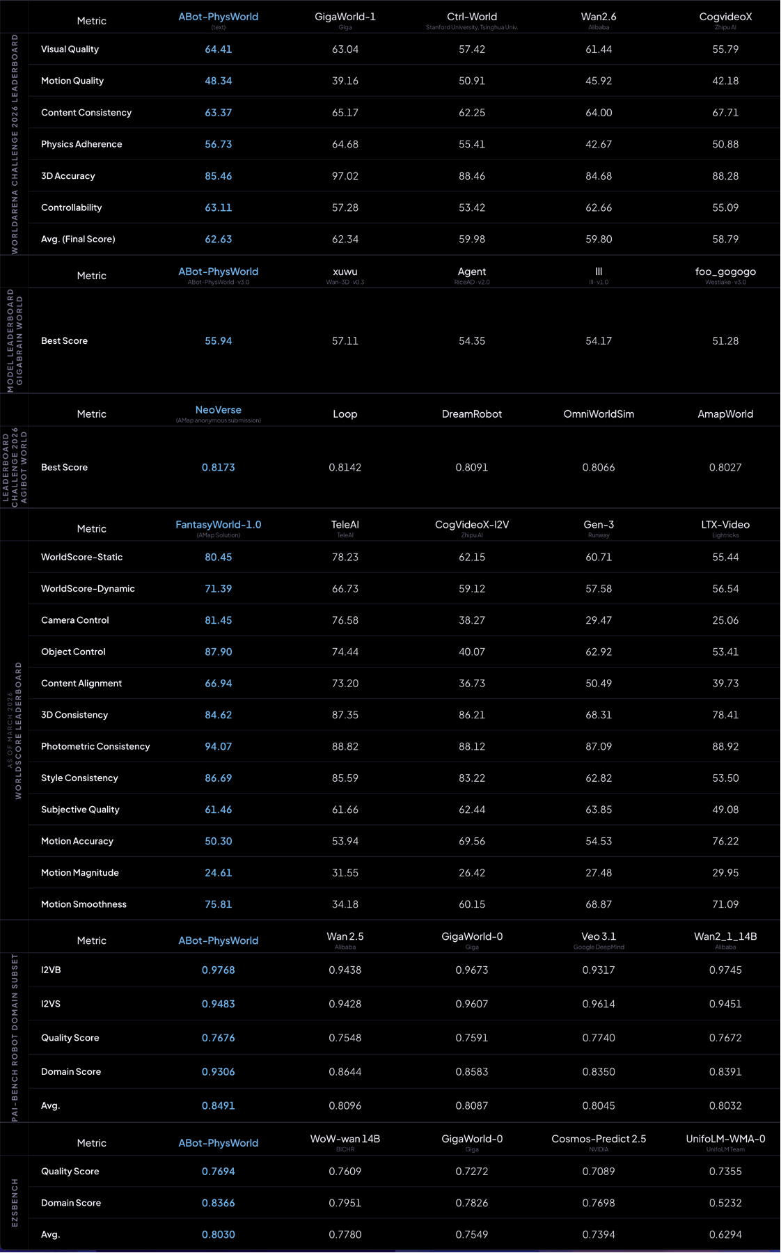 ABot-World 在多个公开且具有代表性的具身智能评测 Leaderboard 和 Benchmark 上完成系统性测试,覆盖物理合规性、动作可控性与零样本泛化能力三个关键维度。所有测试均基于标准协议,结果可复现,数据来源透明。