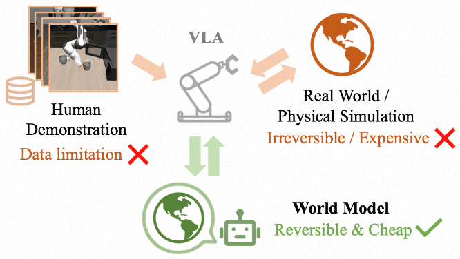 传统世界模型采用最大似然估计(MLE)进行训练,其优化目标为最小化生成帧与真实帧之间的像素级差异。该方式在通用视频生成任务中有效,但在机器人操作场景中存在结构性缺陷:它无法区分物理合规与物理违规样本。例如,物体穿透、无接触抓取、反重力运动等行为,只要像素分布接近真实数据,仍可能被模型视为合法输出。这导致生成结果在视觉上合理,但在动力学上不可执行,限制其在真实机器人系统中的可用性。