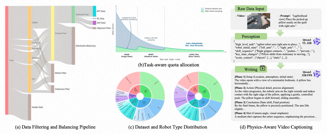 数据来源与规模:整合五大主流开源数据集(AgiBot、RoboCoin、RoboMind、Galaxea、OXE),涵盖多形态机器人与长尾任务场景,累计汇聚近 300万条真实操作视频片段,为模型提供丰富的具身交互信号基础。