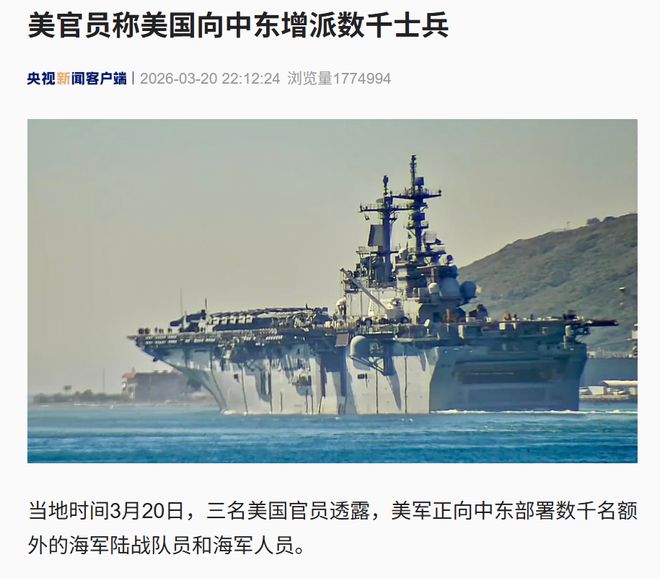当地时间3月20日,美国官员透露,美军正向中东部署数千名额外的海军陆战队员和海军人员。
