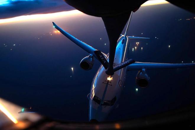 4月21日,在霍尔木兹海峡附近空域内,一架P-8“海神”反潜巡逻机正在接受KC-135“同温层油船”加油机的空中加油服务。