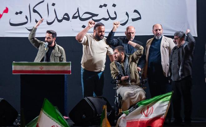 在导弹发射器爆炸事故中失去四肢的一位士兵参加了在德黑兰举行的示威活动。