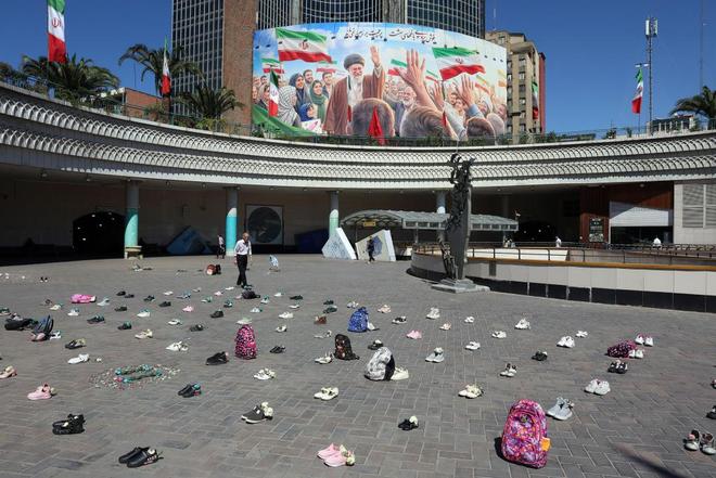 同样在4月22日于德黑兰瓦利阿萨尔广场的现场可以见到米纳布学校遇袭学生遗物摆放,海报背景则是已故伊朗最高领袖哈梅内伊的巨大图像。