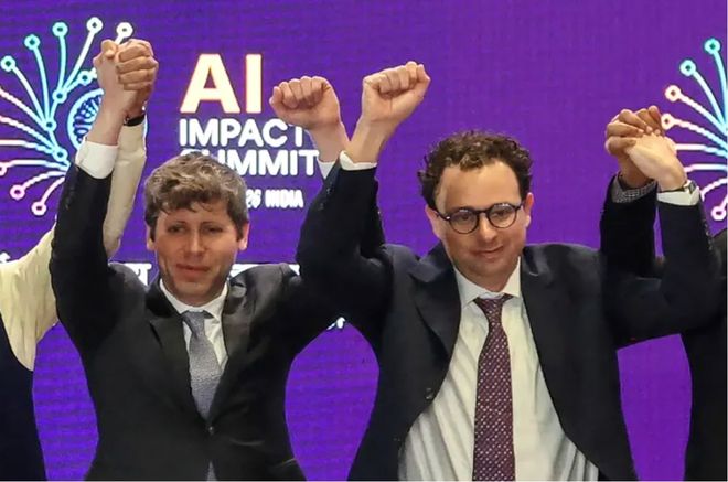 在最近印度举行的人工智能影响力峰会上,美国开放人工智能研究中心(OpenAI)首席执行官奥尔特曼与竞争对手Anthropic公司的阿莫迪并未握手。