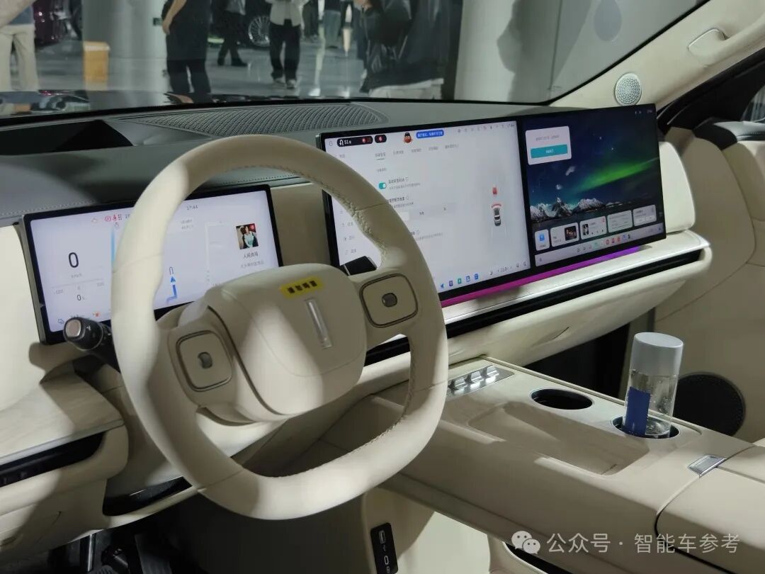 车内,前排是双联屏设计,两块17.3英寸的3K智慧屏连为一体。
