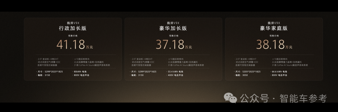 最后看预售价格,魏牌V9X发布了三个版本,在尺寸、电池和电压平台上有所区分: