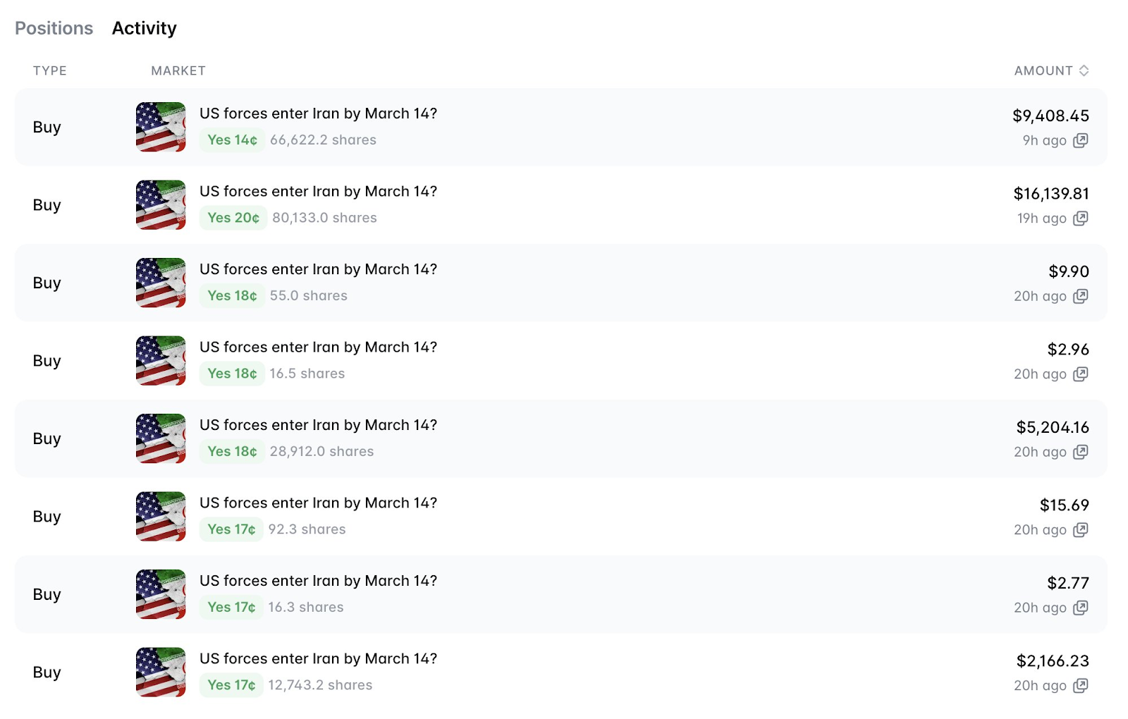 这些账户均在2月份创建,他们都将资金投入到关于美国军事行动时间的合约中,其中一些交易就在德黑兰发生爆炸前数小时完成。