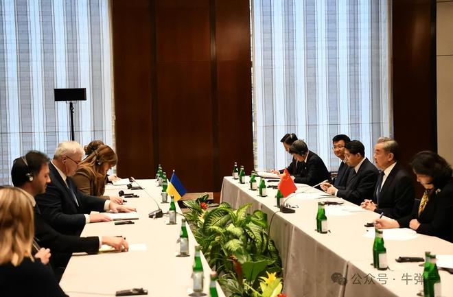 2月13日,在慕尼黑的一次会晤中,王毅外长与乌方外交官进行了会谈。照片显示,乌克兰外长瑟比加面带笑容地握着王毅的手。