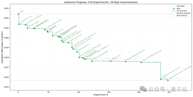 如图所示,在近两百五十轮自主探究中,autoresearch成功筛选出了二十九个有效的优化版本。
