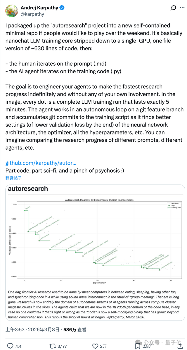 AI研究者Karpathy推出了一项新的开源项目——autoresearch,一个致力于实现科研自动化循环系统的创新工具。