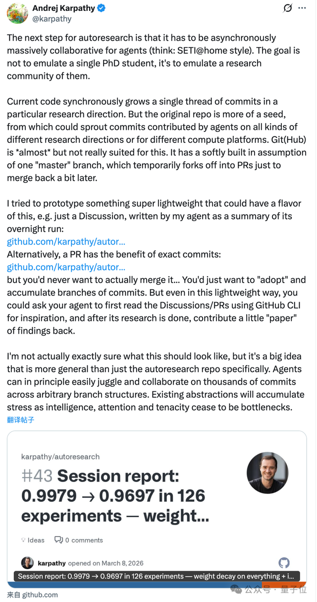 为了突破这种束缚,Karpathy进行了一系列实验性的尝试,包括让智能体在完成运行后通过GitHub讨论板块发布研究总结或提交具体的commit记录。