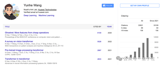 被引数最高的一篇论文,则是与韩凯、田奇等人合作的《Ghostnet: More features from cheap operations》。