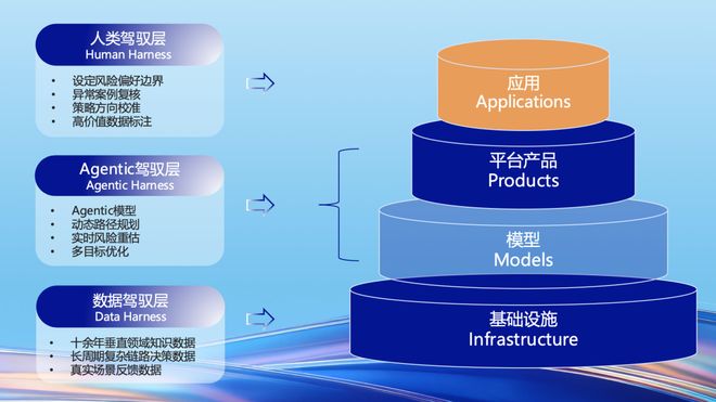 这一三层结构包括人类驾驭层、Agentic驾驭层以及数据驾驭层。