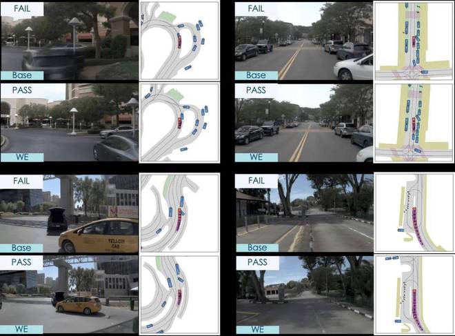 为了进一步放大这些难例场景,世界引擎运用解耦扩散技术生成一系列变体情况,保持真实地图拓扑结构不变的同时引入对抗性交通行为,从而系统地扩大训练数据集中的长尾部分。