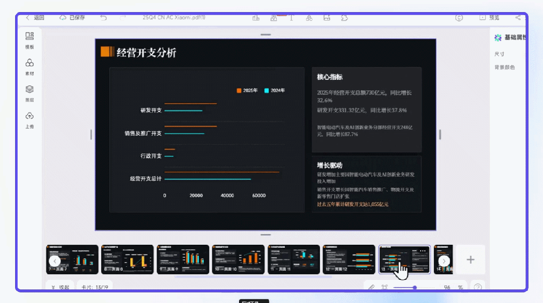 当用户上传一份详细的年报时,系统会自动解析数据背后的故事,并生成一份逻辑连贯的报告。