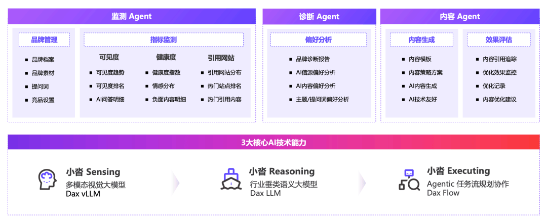 AI时代,每⼀次对话都在影响消费者心智和购买行为决策。品牌的数字资产正在被AI重新定义。小沓AI·智能营销产品致力于成为企业在AI时代的营销引擎,通过先进的Multi-Agent技术与深度的营销洞察,助力品牌跨越人机沟通鸿沟,在未来的AI问答入口中建立不可撼动的“真理定义权”。