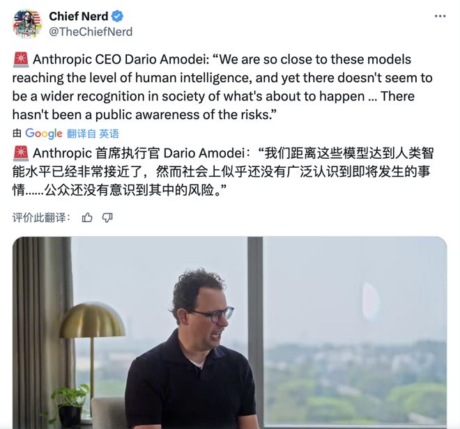 用户@malmesburyman分享了Dario Amodei在采访中的片段,并附上了一条评论: