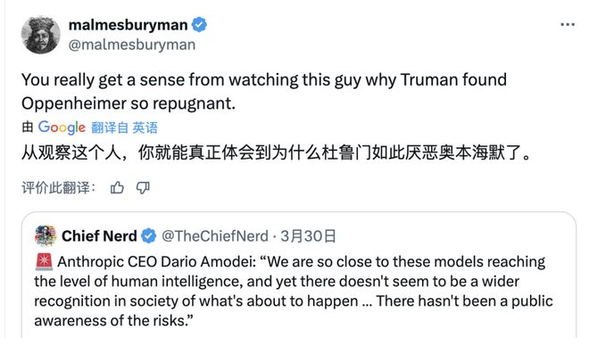 这一评论引起了两极分化的反应。支持者认为Amodei一边开发强AI一边谴责风险的行为就像奥本海默在制造原子弹后才表示悔恨一样;