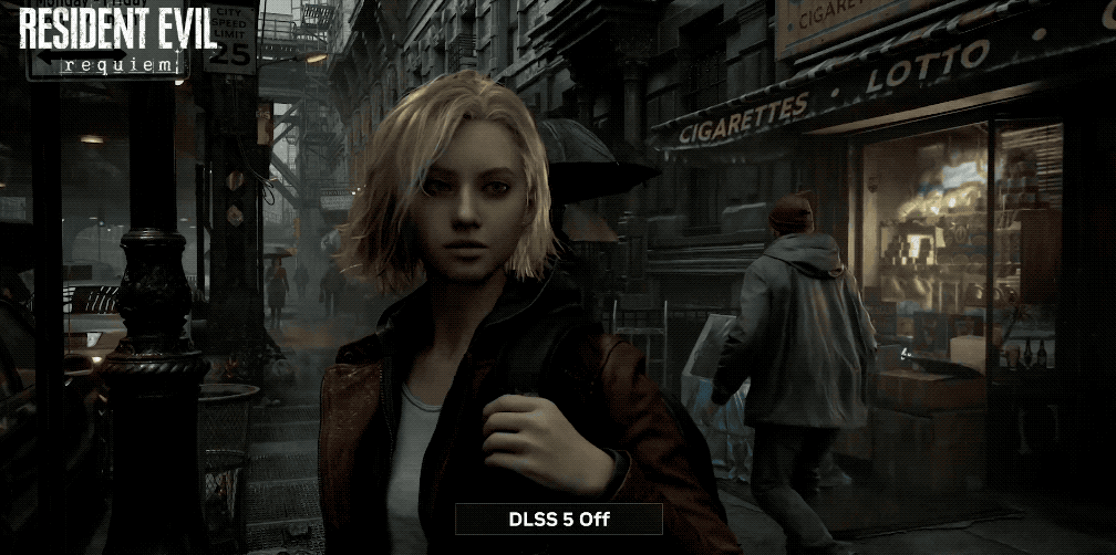 《生化危机:安魂曲》中的格蕾丝在DLSS 5开启前后,脸部模型有了一些细微的变化