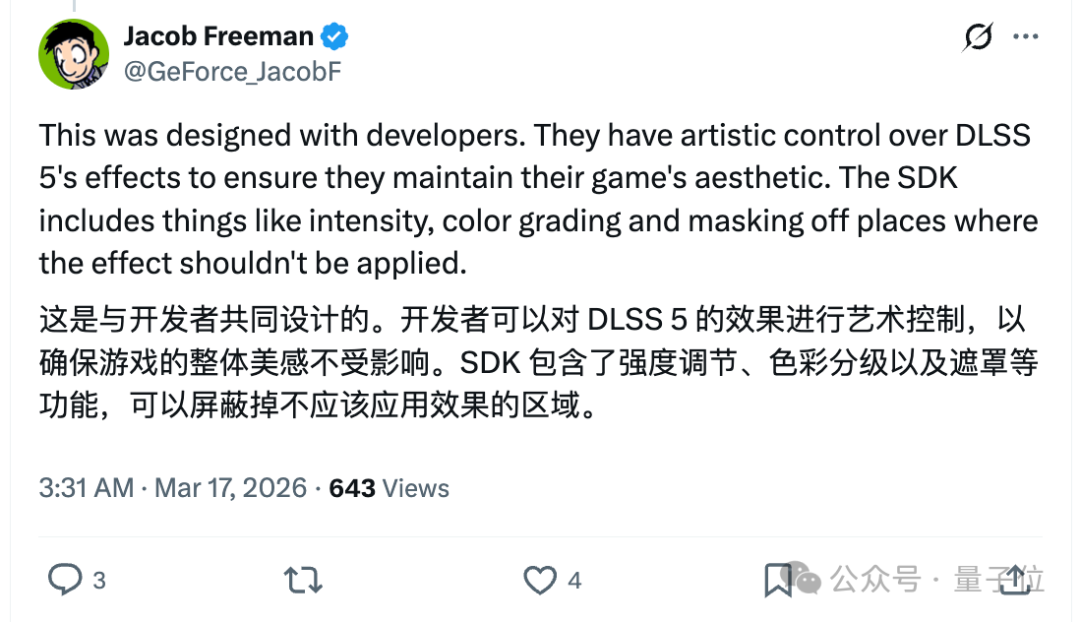 贝塞斯达则在评论区表示,即将登陆《星空》和《上古卷轴 4:湮没》重制版的DLSS 5支持完全由其美术人员掌控