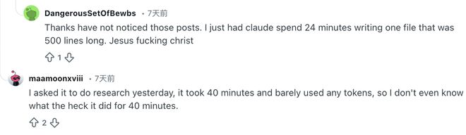 一位名叫DangerousSetOfBewbs的网友表示,他曾让Claude处理一个500行文件的任务,结果它陷入了长达24分钟的沉思状态。还有人说看到它在思考40分钟后几乎没用Token。