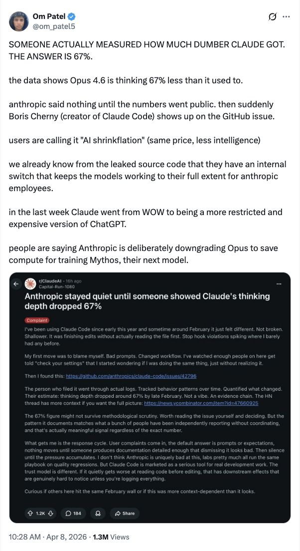 网红开发者奥姆·帕特尔直接指出,有人测出了Claude变笨了大约67%的程度。