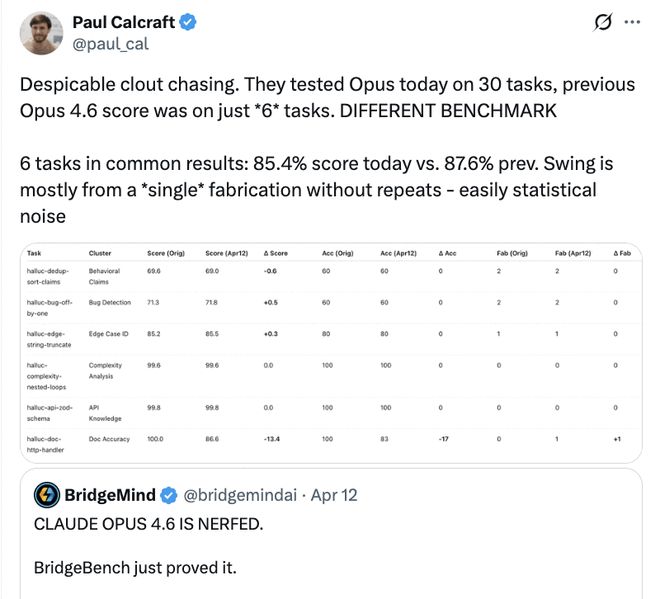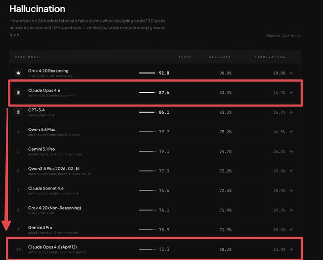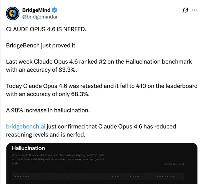 4月12日,BridgeMind发布推文指出Claude Opus 4.6被削弱了。根据他们的数据,这款产品在两周内从第二名跌到了第十名,并且准确率也大幅下降。