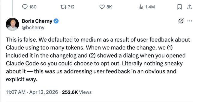面对用户的广泛不满,Anthropic官方团队进行了回应,辩称他们从未削弱模型性能,而是一系列默认配置优化旨在帮助用户节省Token费用。