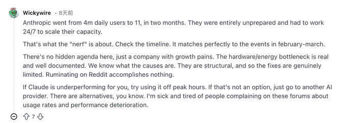 网友Wickywire则分析了其中的根本原因,Anthropic在两个月内日活用户从400万涨到了1100万,他们完全没有准备并不得不全天候连轴转去拼命扩容,这就是所谓削弱的真相。你去对时间线,和二三月份发生的事完全吻合。