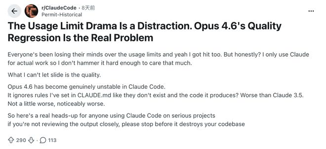 许多付费用户声称自己支付了高额月费后,得到的却是明显缩水且表现不佳的新版本。Opus 4.6不仅变得懒散健忘,在处理基本逻辑时也频频出错。