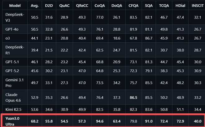 ChatRAG涵盖长文本检索、短文本与结构化检索及维基百科检索,Yuan3.0 Ultra在这项测试中的平均准确率68.2%,10项任务中9项位居首位。