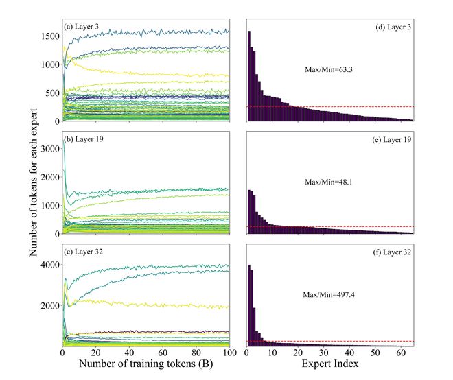 在预训练过程中,各层专家的token分布和负载分布呈现出明显的不均衡趋势。