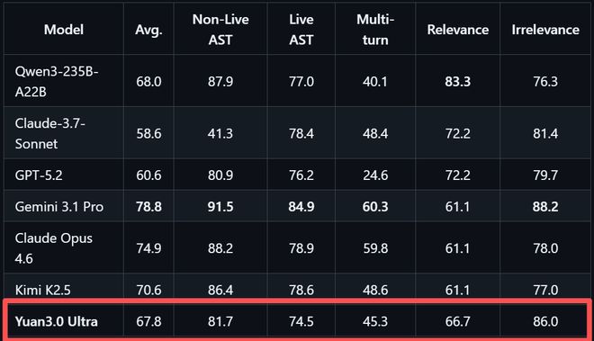 精通多步骤工具调用与协作,为自动化执行复杂任务打下坚实基础,是Agent应用关键能力,在智能体工具调用方面,Yuan3.0 Ultra表现均衡,在工具调用评测BFCL V3中平均得分67.8%。