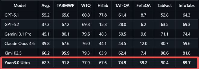 多模态复杂表格理解评测MMTab覆盖表格问答、事实核查、长文本表格处理等多个任务类型,Yuan3.0 Ultra在这一测试中以62.3%的平均准确率超越Claude Opus 4.6和Gemini 3.1 Pro。