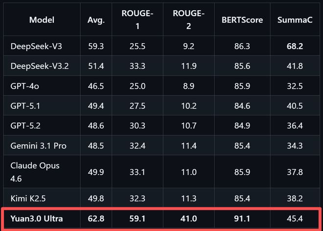 在文本摘要生成评测SummEval中,Yuan3.0 Ultra以62.8%的平均精度表现出色。