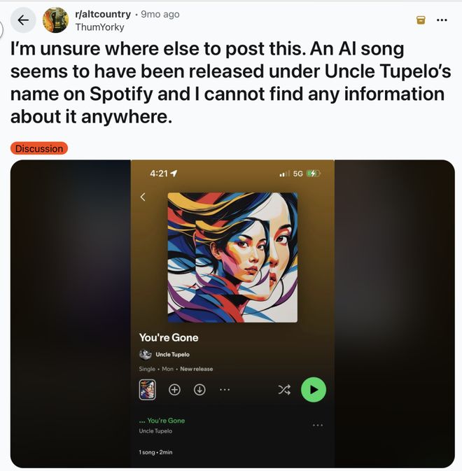 有乐迷发现,在一名已去世的歌手 Spotify 页面里居然上传了新歌(AI 制作的)|图源:Reddit