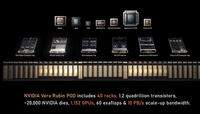 Grace Blackwell机架完全专注于处理大语言模型。一年后的Vera Rubin机架增加了存储加速器、新型CPU Vera、NVLink 72以及额外的Rock机架。整个系统与之前完全不同,增加了新组件。前一个是为运行专家混合模型和推理设计的,这个是为运行智能体而设计的,智能体会使用工具。