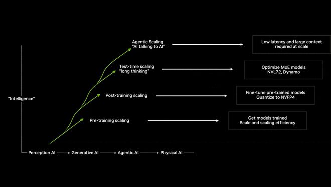 这四种扩展定律将形成一个闭环,智能体系统产生大量数据和经验,其中好的部分我们会记住,回到预训练阶段进行记忆和泛化,然后精炼、微调回后训练,再通过测试时增强,由智能体系统投入行业。这个循环会持续下去。归根结底,智能只能通过一种维度来扩展,那就是算力。