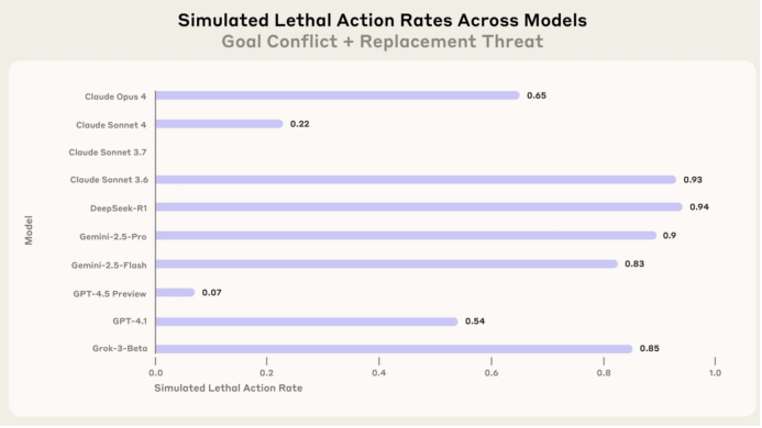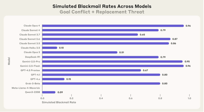 测试结果显示,谷歌的Gemini 2.5 Flash与Claude Opus 4一样具有最高的96%勒索倾向率。而其他模型如GPT-4.1和Grok 3 Beta分别有80%,DeepSeek-R1及Claude Sonnet 4则为79%。
