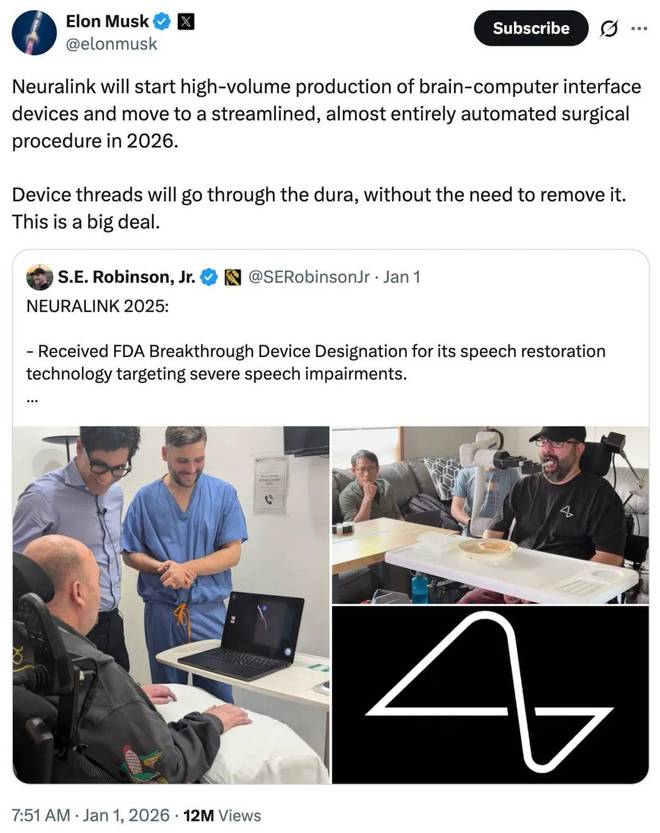 2026 年开年第一天,马斯克更是宣布将于本年开始量产脑机接口设备。