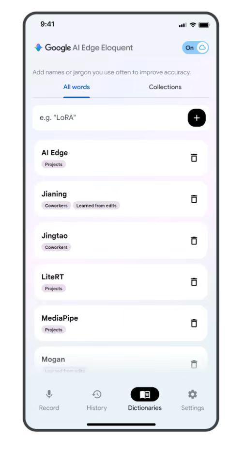 在保障隐私的同时,这款应用程序还支持切换至云端使用Gemini模型来改善文本质量。此外,Eloquent引入了个性化词汇机制,可以根据用户的常用表达建立专属词典以提高识别准确度。