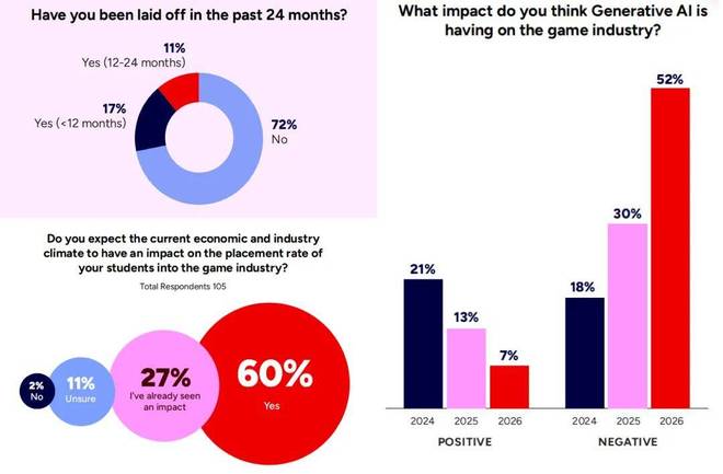 根据 GDC 的官方报告,超过 28% 的从业者在过去两年内遭遇过裁员,高达 74% 的学生对未来的就业前景感到焦虑;同时,虽然有半数以上的开发者对 AI 在游戏开发中的应用持负面态度,但实际的 AI 工具使用率却在持续上升。