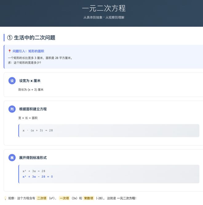 当输入“生成一元二次方程教学课件”的指令后,九章龙虾会根据新课程标准的要求自动生成一份包含背景介绍、定义以及习题的完整课件,并且提供多种解法供参考。其内容还会紧密结合学生的认知水平进行调整。