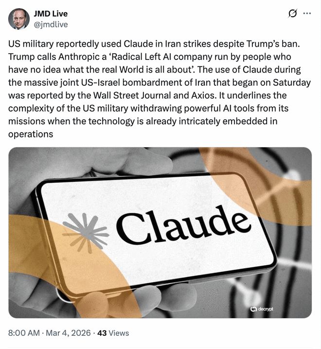 即便在舆论上受到严厉打压,美军一线部队依然高度依赖Claude提供的算力和决策支持。