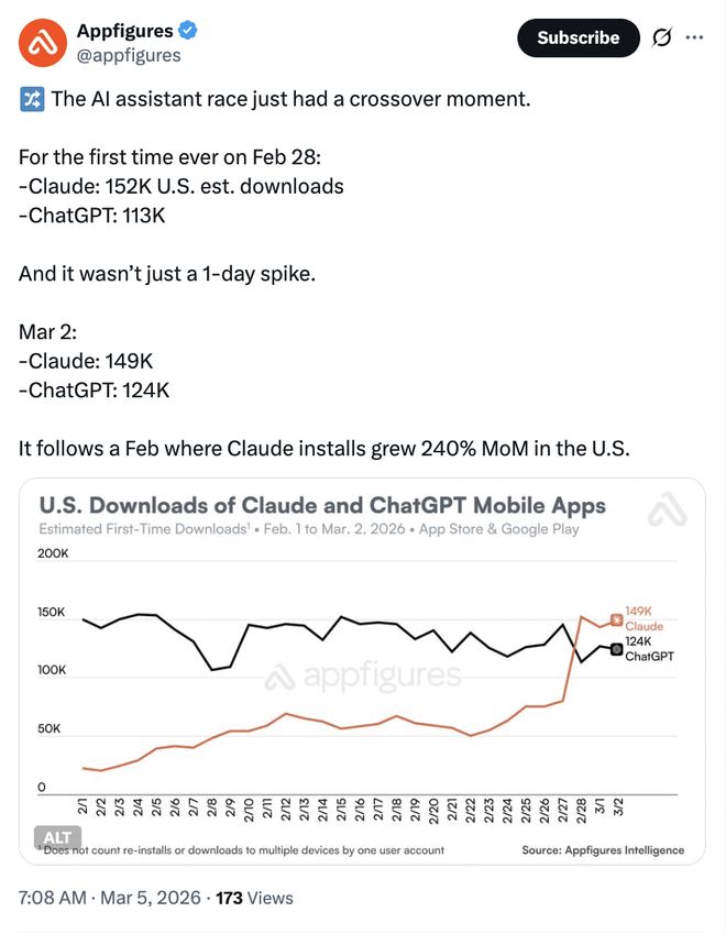 在美国政府发布行政禁令后,意外地引发了市场连锁反应。当特朗普总统批评Anthropic首席执行官时,Claude在苹果App Store上的下载量异常飙升,并迅速超越ChatGPT,登顶免费榜。