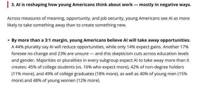 报道中还提及一个令人不安的现象:近四成的年轻人认为人工智能会使工作变得毫无意义。