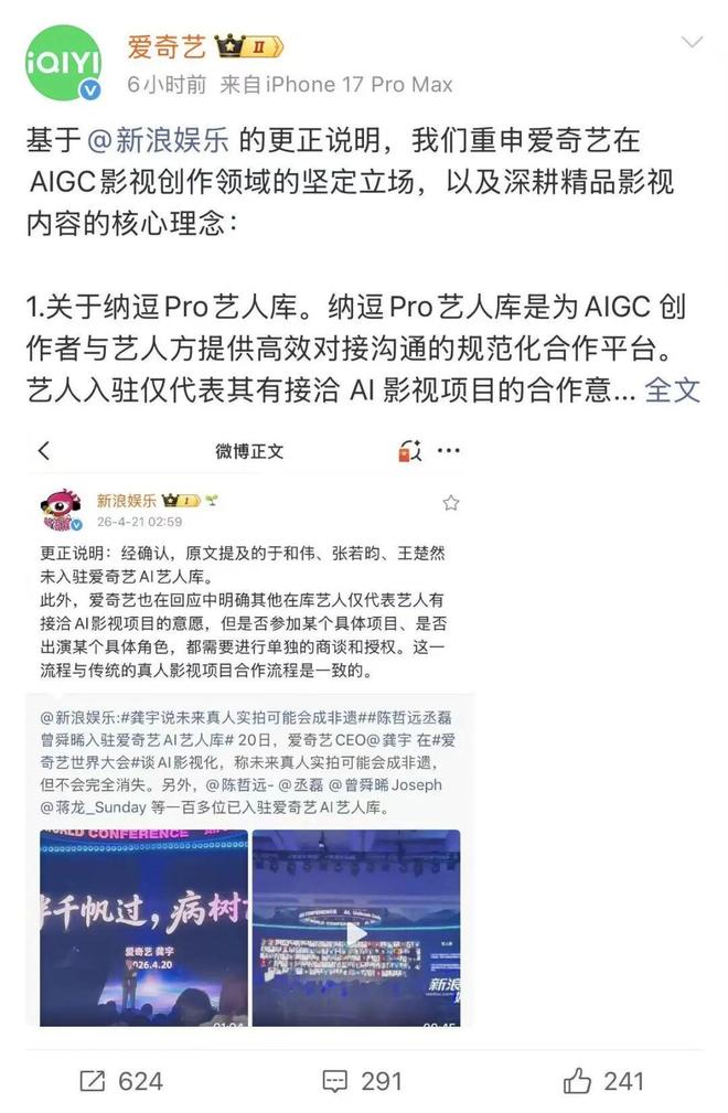 在4月21日的凌晨,爱奇艺发表声明重申了其在影视创作领域中对AIGC技术应用的态度和理念: