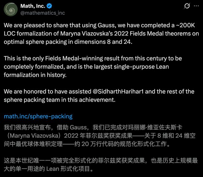 数学作为所有自然科学的底层语言,其工程化进度的加快,将直接传导至密码学、量子计算、航天轨道计算等强逻辑领域。