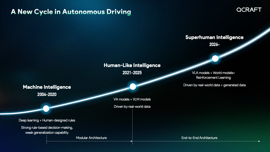 于骞博士在演讲中指出,物理人工智能已成为全球人工智能领域的新热点,而自动驾驶则是开启这一新时代的关键领域。轻舟智航将人工智能的发展划分为三个阶段:从模仿人类智能到探索类人智能,再到即将到来的超人智能阶段,预计于2026年开始。